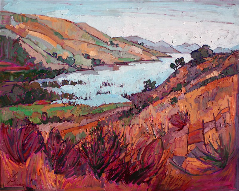 This painting pushes the autumn shades of central California to the next level, creating a burst of subtle color with expressive brushwork. The paint is laid on in thick strokes, in a mosaic-like style of application. Whale Rock Reservoir is located between Paso Robles and Morro Bay.