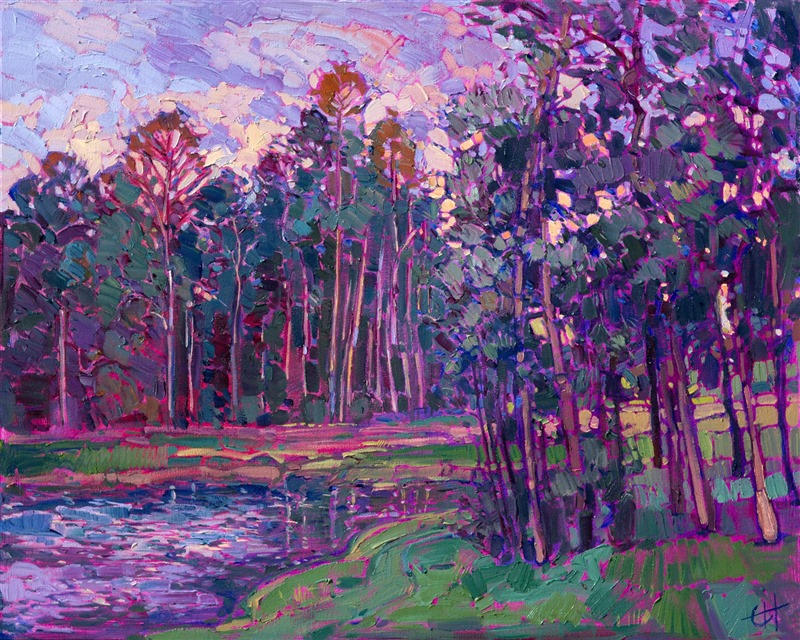 The Woodlands has many beautiful lakes and ponds, nestled between groves of impossibly tall pine trees. This painting captures the incipient colors of dusk in rich purples and viridian greens. The brush strokes are thick and expressive with color and texture.