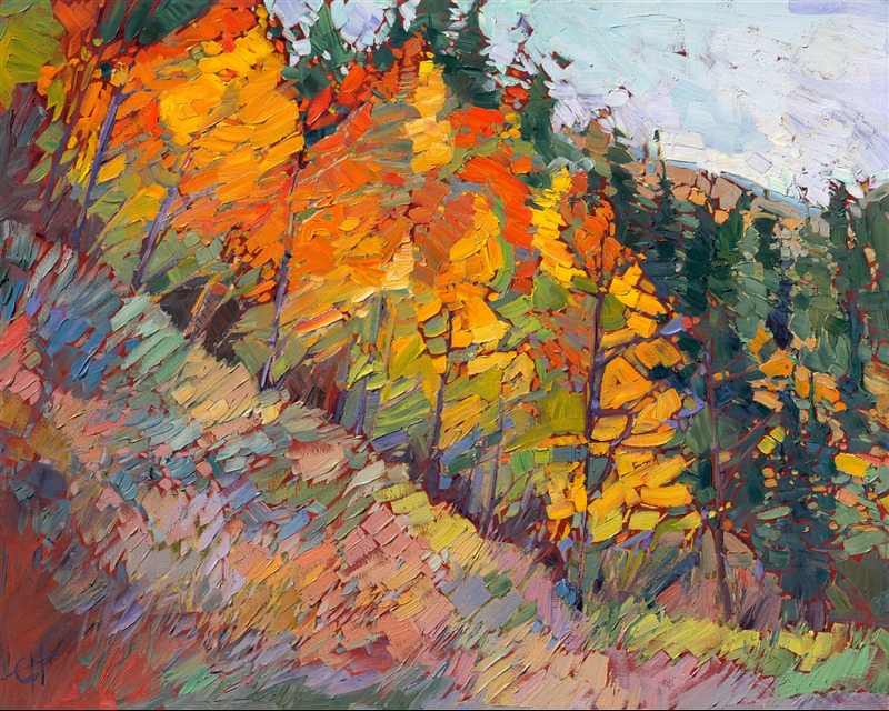 Note on varnishing: Erin’s paintings take six to eight weeks to dry, at which time we apply a retouching varnish, which allows the painting to complete the curing process while having a layer of protection against dirt and scuffs. The full curing process for an impasto oil painting takes at least two years. We are happy to assist in applying a final finishing varnish to your Erin Hanson oil painting once it has been dry for at least two years. Here is more information on how to care for your original oil painting.