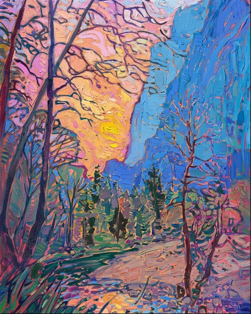 This painting of Yosemite valley captures the colors of sunset against the striking blue of the mountain cliffs. The brush strokes are laid side by side, without layering, in Hanson's unique Open Impressionism style. The vivid colors are created from a limited palette of only five colors.