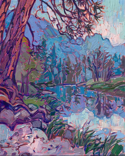 A hazy afternoon in Yosemite inspired me to paint this painting of Yosemite Valley reflected in a still pool of water. Loose, expressive brush strokes capture the movement and beauty of the scene.