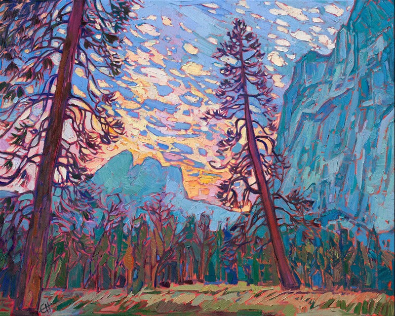 Framing: "Yosemite Sky" is an original oil painting on stretched canvas. The piece arrives framed in a gold "EH frame," ready to hang.