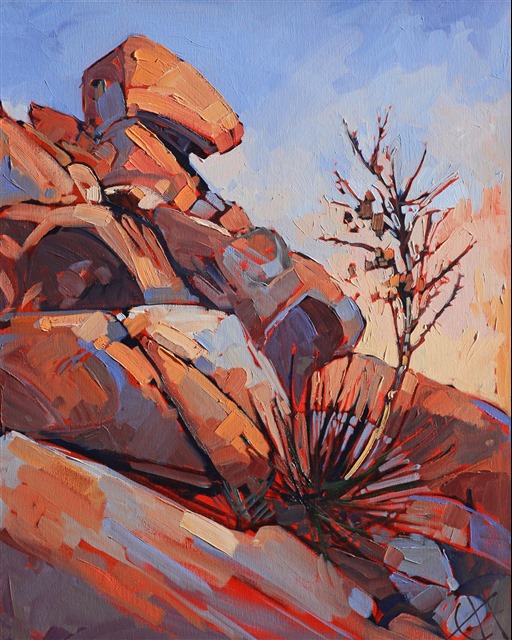 Original oil painting of Joshua Tree National Park. The soft colors of pre-dawn reflect pink and blue off the granite boulders. The brush strokes in this painting are thick and expressive, creating a beautiful mosaic of color and texture.