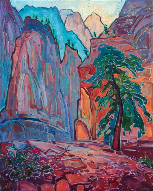 ERIN HANSON has been painting in oils since she was 8 years old. As a teenager, she apprenticed at a mural studio where she worked on 40-foot-long paintings while selling art commissions on the side. After being told it was too hard to make a living as an artist, she got her degree in Bioengineering from UC Berkeley. Afterward, Erin became a rock climber at Red Rock Canyon, Nevada. Inspired by the colorful scenery she was climbing, she decided to return to her love of painting and create one new painting every week.