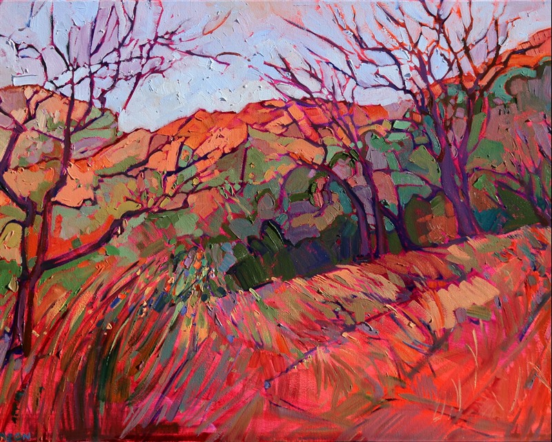 Style: "Open Impressionism" is a new style of painting developed by American artist Erin Hanson. The style is characterized by short, impasto brush strokes that are applied without layering, creating a mosaic or stained-glass appearance to the paintings. The paintings are created with a limited palette of colors, applied without blending or mixing upon the canvas, which adds a dimension of texture to each brush stroke. Inspired by classic impressionism, pointillism, and post-impressionism, Erin Hanson continues the tradition of impressionism into the modern day with her colorful and vivacious landscape paintings.