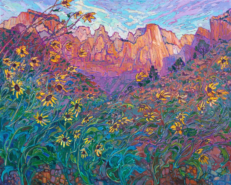 Zion National Park is captured in bold, impressionistic color, in Hanson's iconic Open Impressionism style. The brush strokes are thickly applied without overlapping, creating a mosaic of color and texture across the canvas. This large painting re-creates all the grandeur of southern Utah.