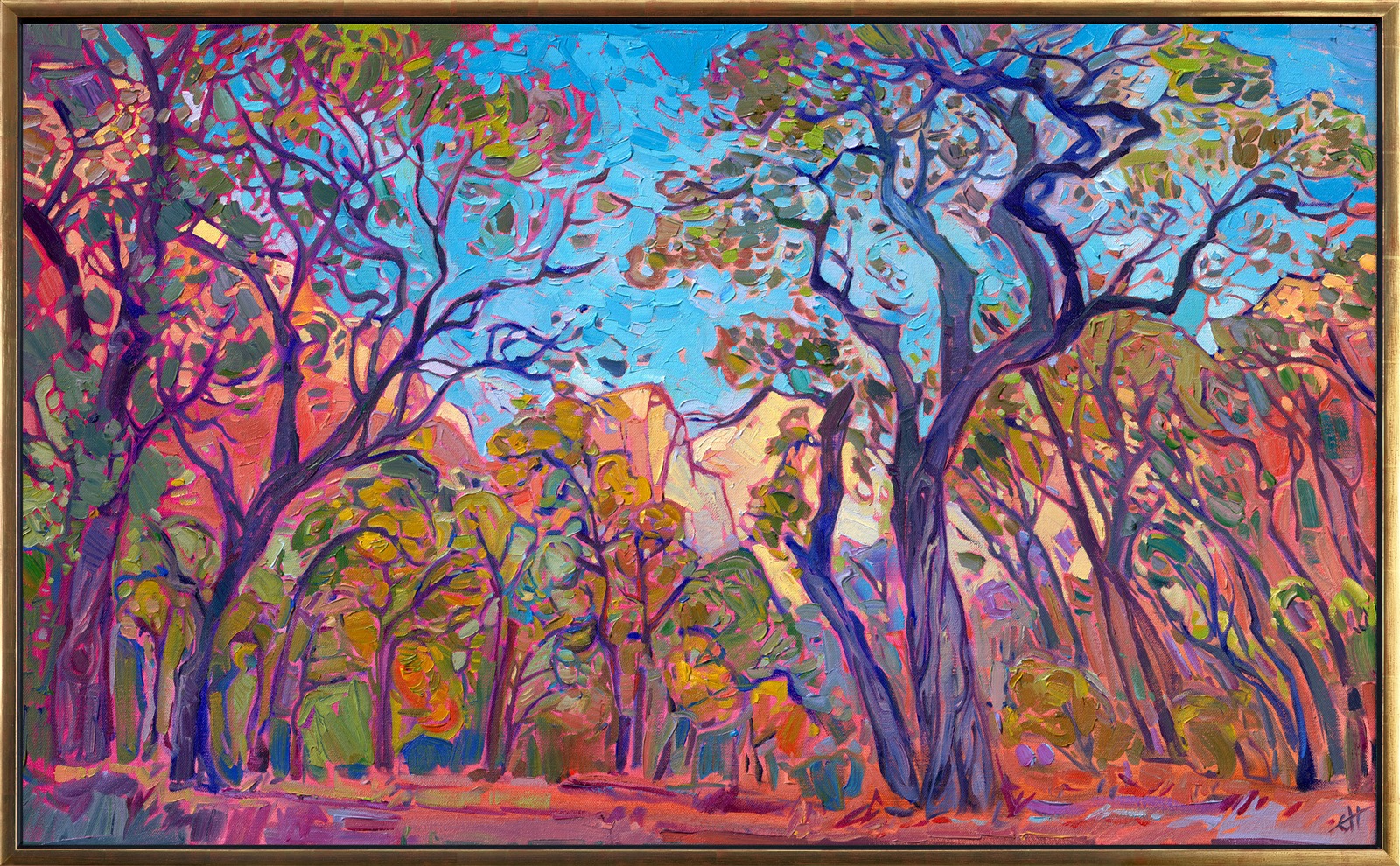 Framing: "Zion Lights" is an original oil painting created on stretched canvas. The piece arrives framed in a custom wooden frame finished in 23kt gold leaf.