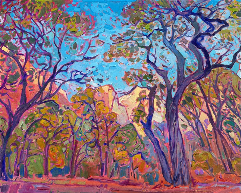 Style: "Open Impressionism" is a new style of painting developed by American artist Erin Hanson. The style is characterized by short, impasto brush strokes that are applied without layering, creating a mosaic or stained-glass appearance to the paintings. The paintings are created with a limited palette of colors, applied without blending or mixing upon the canvas, which adds a dimension of texture to each brush stroke. Inspired by classic impressionism, pointillism, and post-impressionism, Erin Hanson continues the tradition of impressionism into the modern day with her colorful and vivacious landscape paintings.