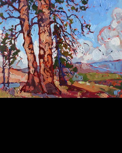 Style: "Open Impressionism" is a new style of painting developed by American artist Erin Hanson. The style is characterized by short, impasto brush strokes that are applied without layering, creating a mosaic or stained-glass appearance to the paintings. The paintings are created with a limited palette of colors, applied without blending or mixing upon the canvas, which adds a dimension of texture to each brush stroke. Inspired by classic impressionism, pointillism, and post-impressionism, Erin Hanson continues the tradition of impressionism into the modern day with her colorful and vivacious landscape paintings.