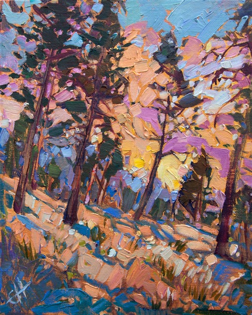 Style: "Open Impressionism" is a new style of painting developed by American artist Erin Hanson. The style is characterized by short, impasto brush strokes that are applied without layering, creating a mosaic or stained-glass appearance to the paintings. The paintings are created with a limited palette of colors, applied without blending or mixing upon the canvas, which adds a dimension of texture to each brush stroke. Inspired by classic impressionism, pointillism, and post-impressionism, Erin Hanson continues the tradition of impressionism into the modern day with her colorful and vivacious landscape paintings.