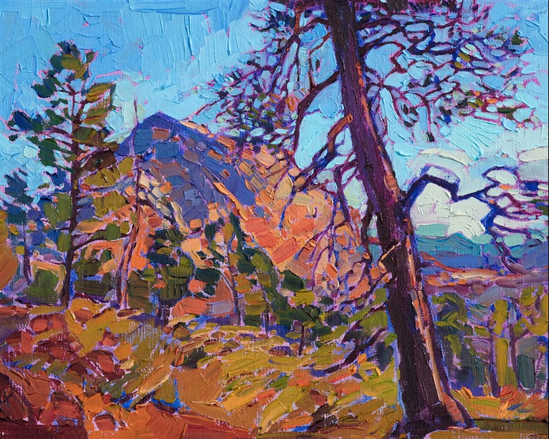 Style: "Open Impressionism" is a new style of painting developed by American artist Erin Hanson. The style is characterized by short, impasto brush strokes that are applied without layering, creating a mosaic or stained-glass appearance to the paintings. The paintings are created with a limited palette of colors, applied without blending or mixing upon the canvas, which adds a dimension of texture to each brush stroke. Inspired by classic impressionism, pointillism, and post-impressionism, Erin Hanson continues the tradition of impressionism into the modern day with her colorful and vivacious landscape paintings.