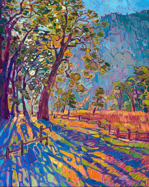 Style: "Open Impressionism" is a new style of painting developed by American artist Erin Hanson. The style is characterized by short, impasto brush strokes that are applied without layering, creating a mosaic or stained-glass appearance to the paintings. The paintings are created with a limited palette of colors, applied without blending or mixing upon the canvas, which adds a dimension of texture to each brush stroke. Inspired by classic impressionism, pointillism, and post-impressionism, Erin Hanson continues the tradition of impressionism into the modern day with her colorful and vivacious landscape paintings.